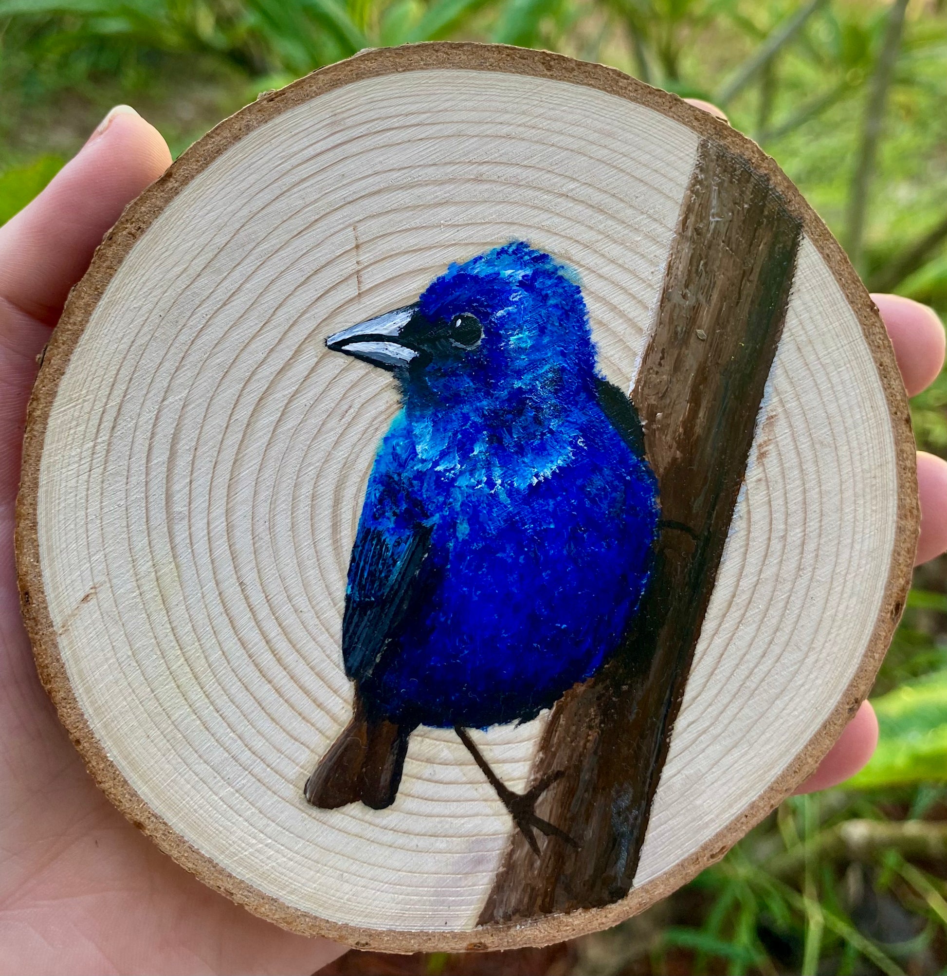 Acrylic painting of a male Indigo Bunting on a 3inch wood round