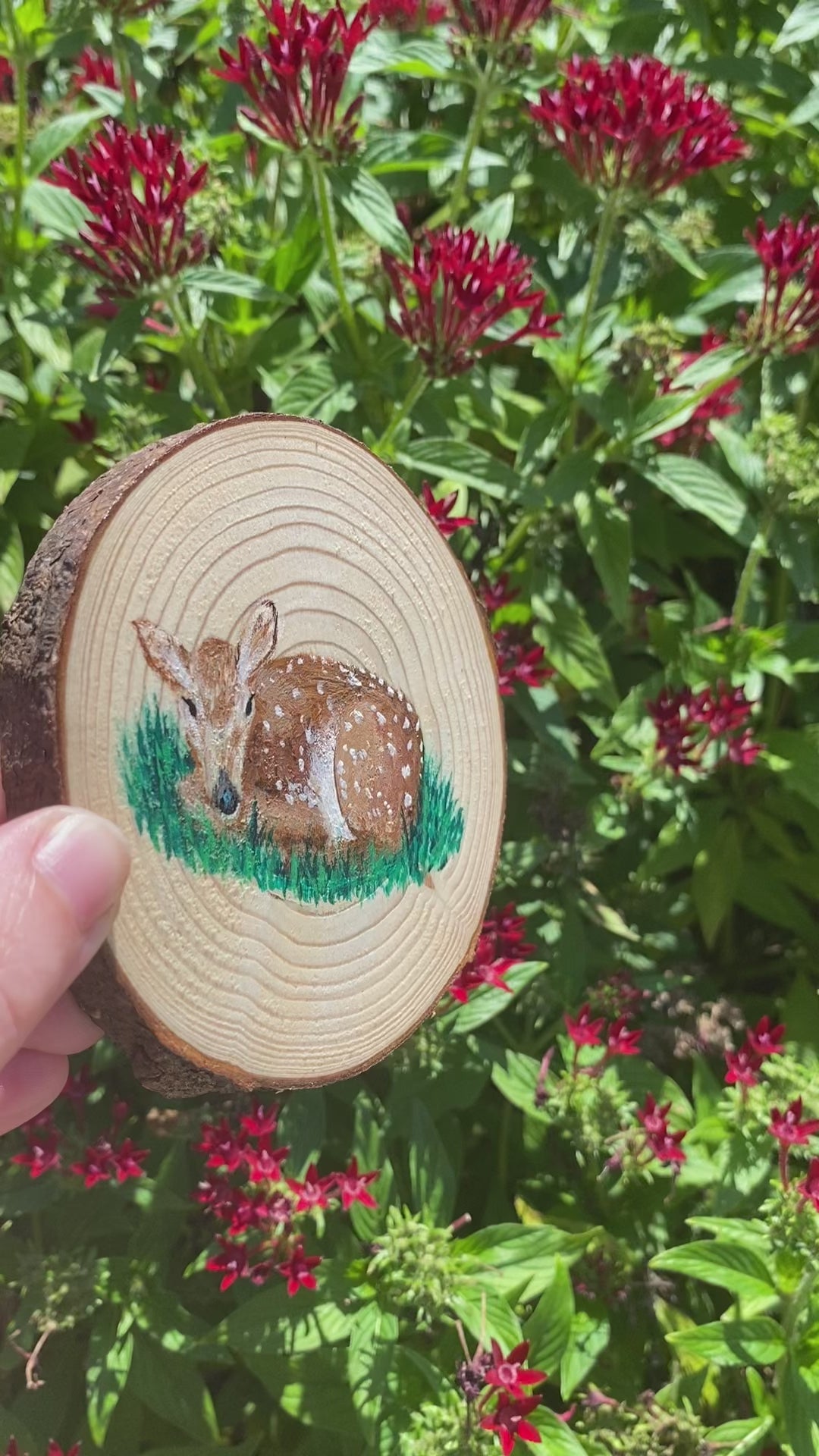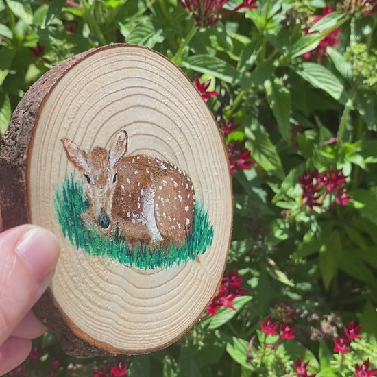 Hand painted fawn resting on grass on 3 1/2 inch wood round using acrylic paint. Sealed with varnish.